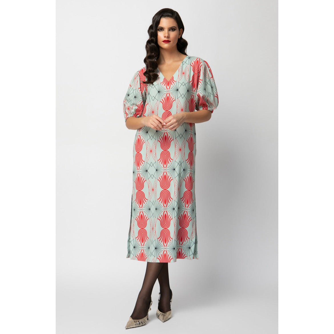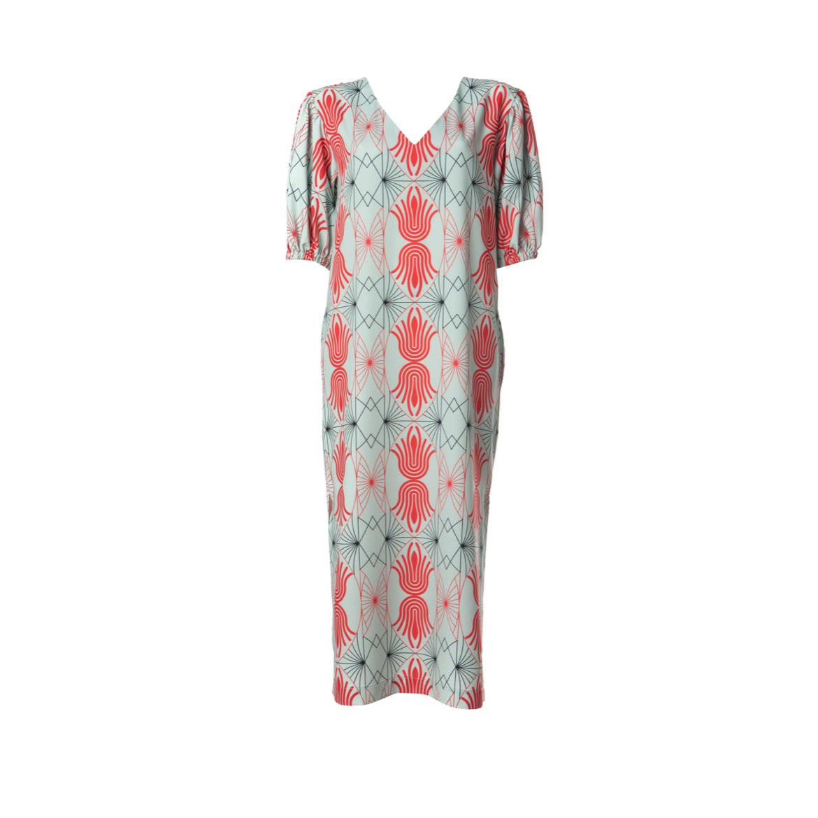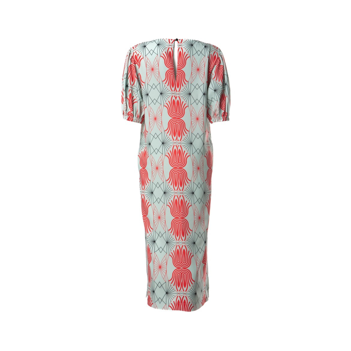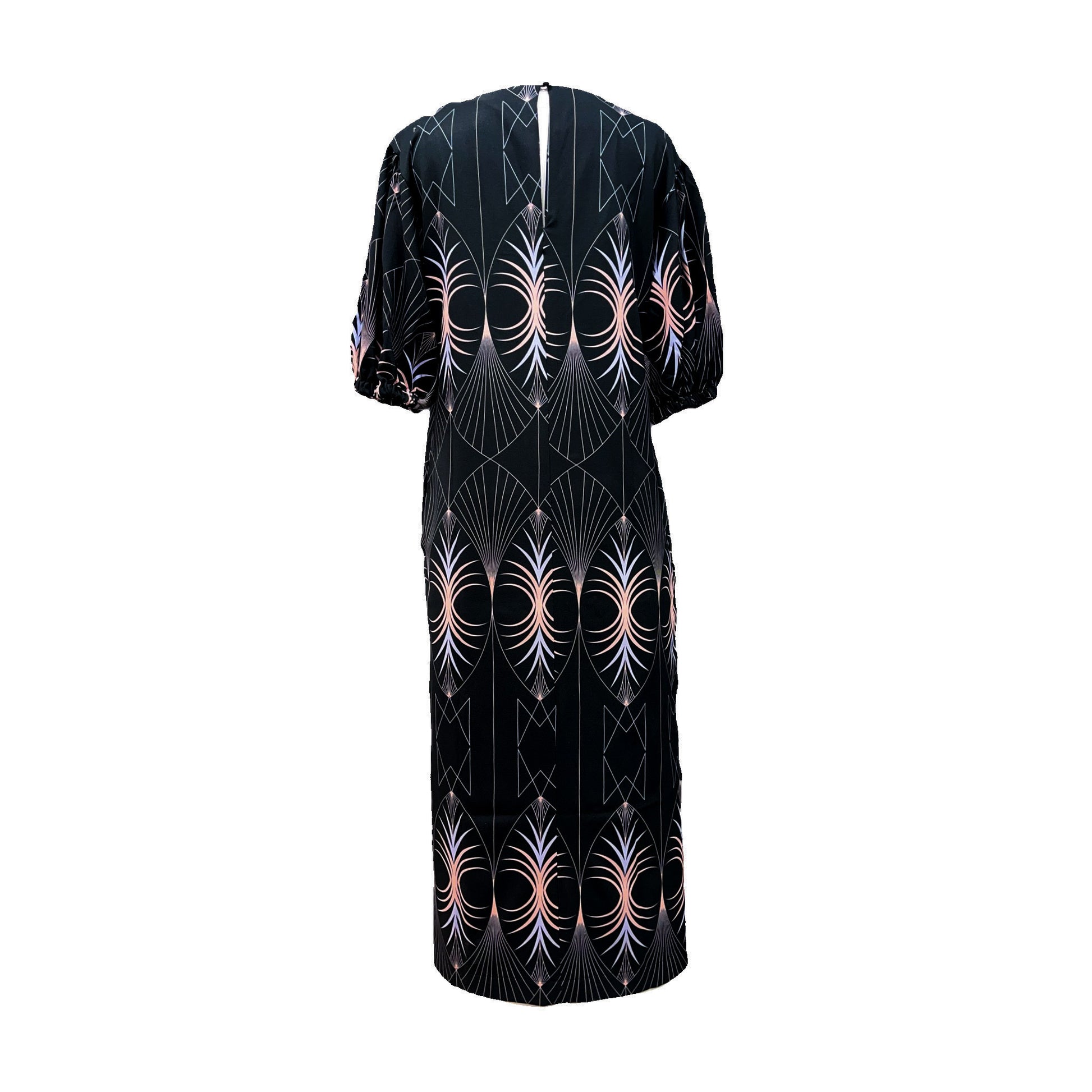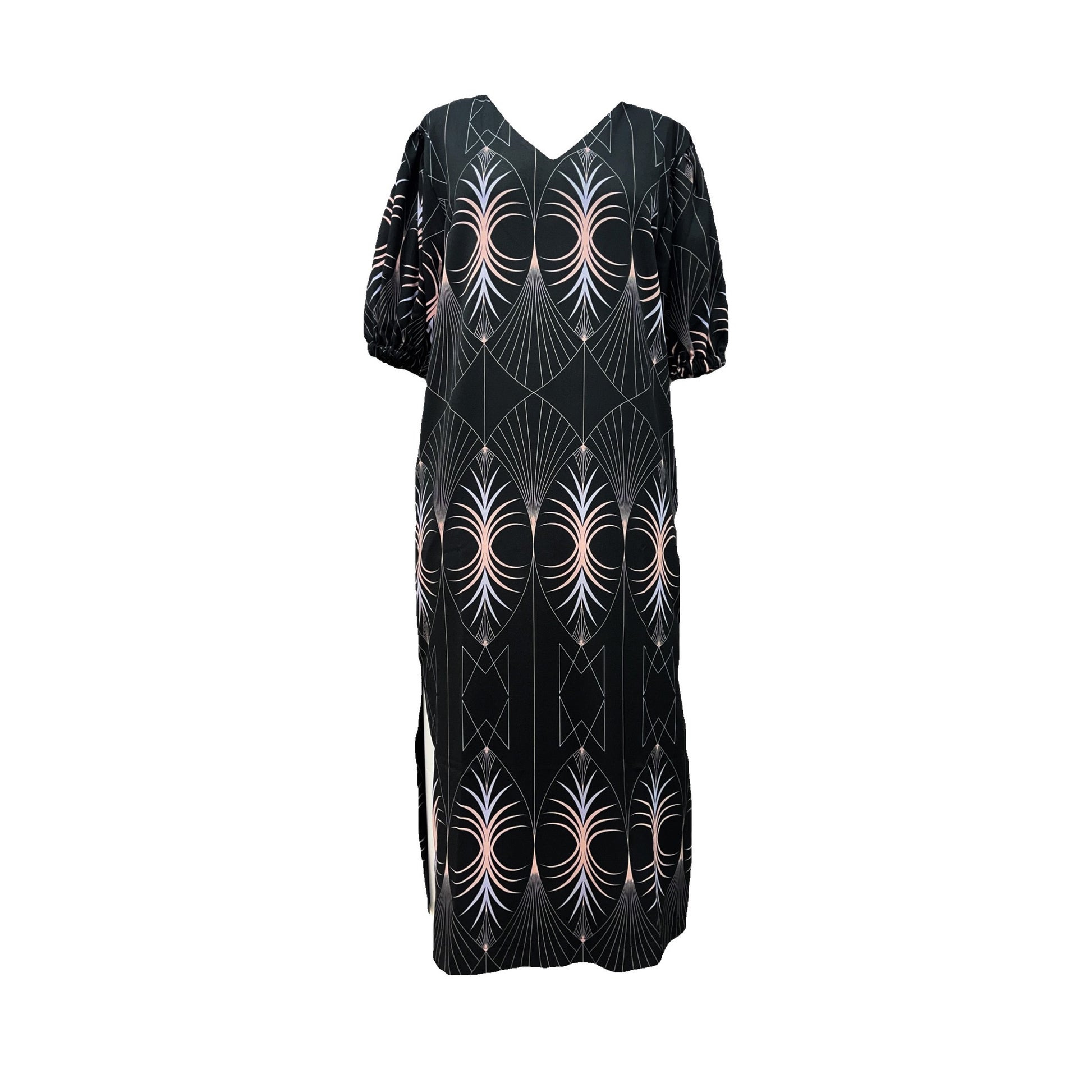 Fits true to size, take your normal size. Maxi length. Motif exclusively designed for The MAnnequin Collection. Puff short sleeves. Side slits. Straight hem. Button fastening in the back. Side pockets. Mid-weight material. Made in Greece.