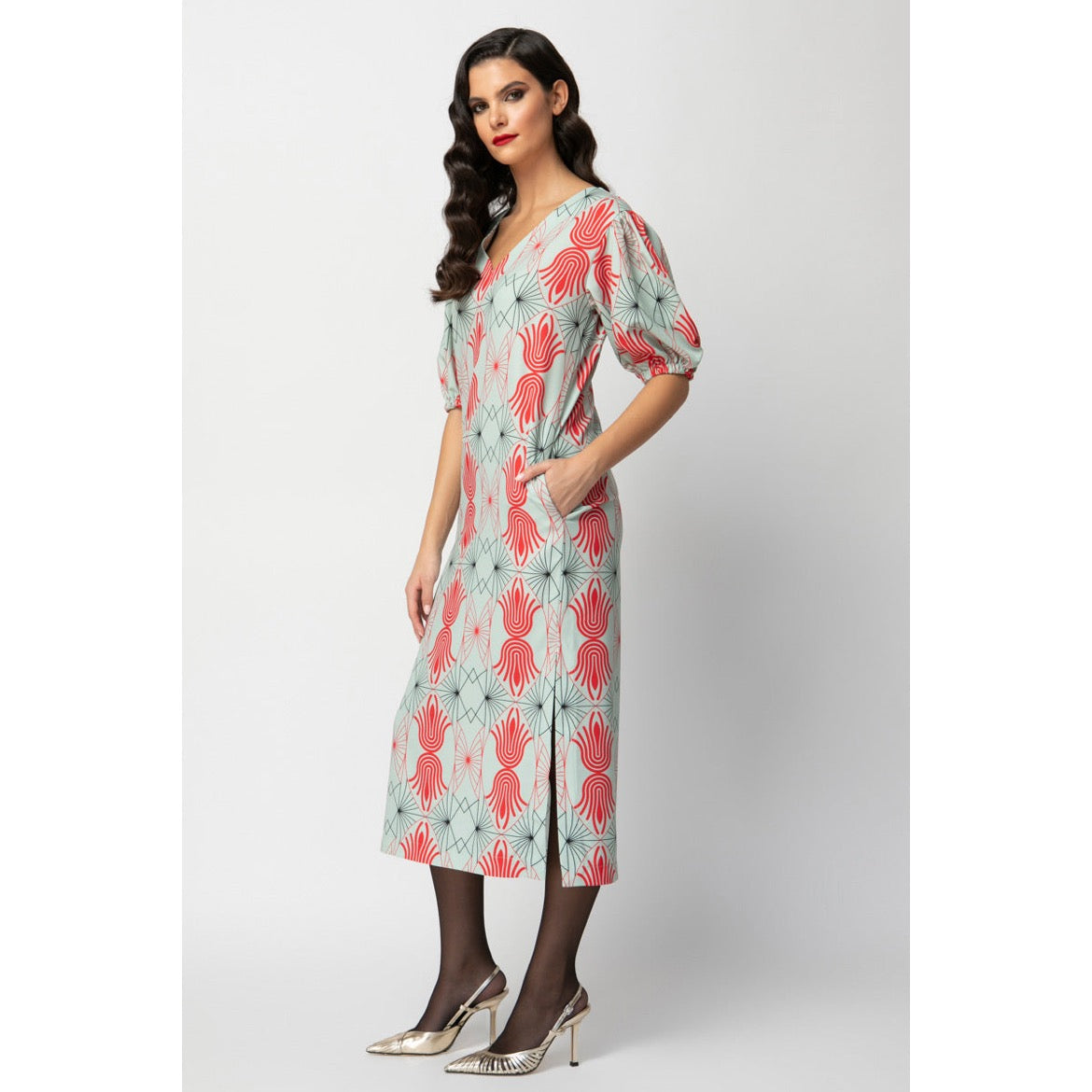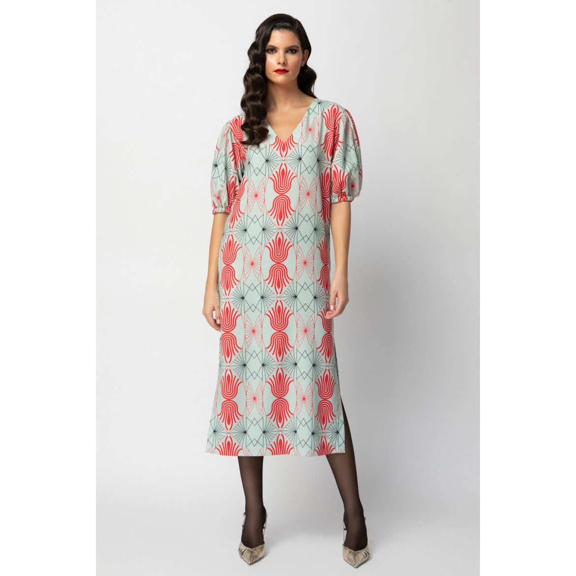 Is it summer? Or is it winter? Our Ella Dress is made for both, ragazze! Cut from a mid-weight airy fabric with a V-neckline, cute side slits and a maxi hem, we have given it a twist with statement puff sleeves and splashed it with two of our exquisitely placed, the Palmagic Black and Coraluscious Mint motifs, that add an enchanting edge. Go for accessories that pick out both prints.