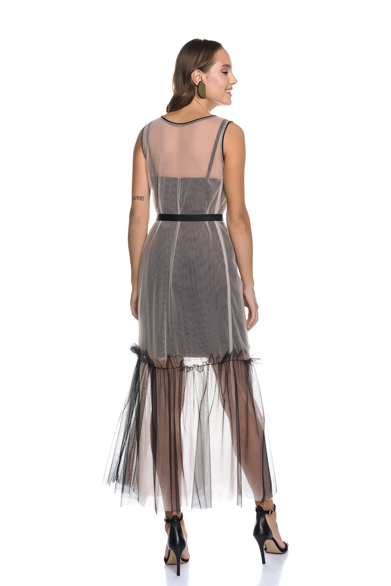 MAXI NUDE TULLE DRESS +LITTLE BLACK SATIN DRESS - 2 in 1 DRESS