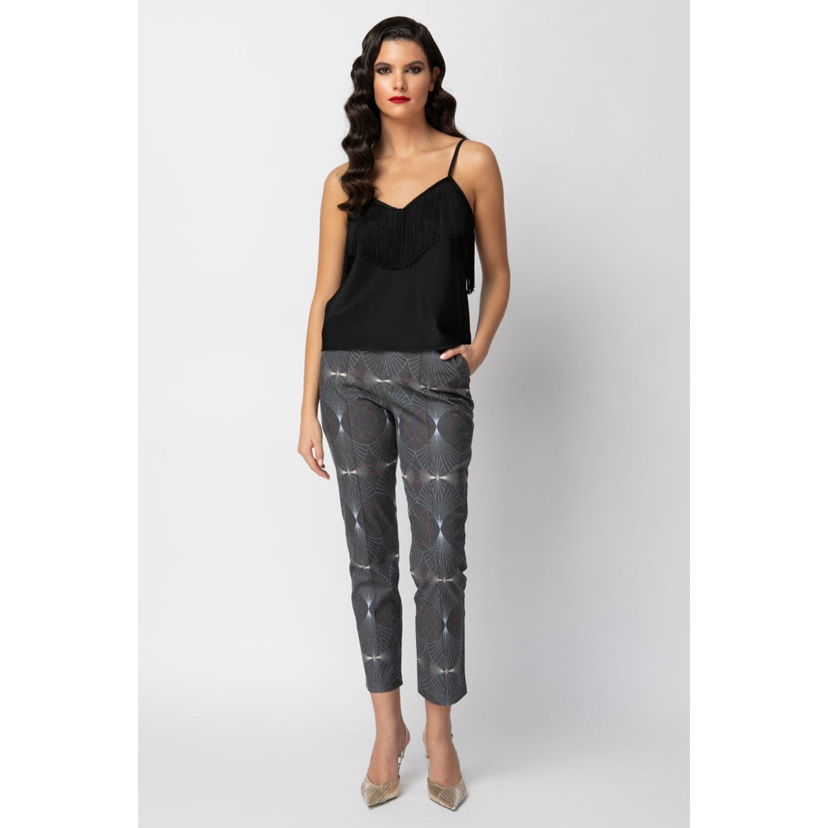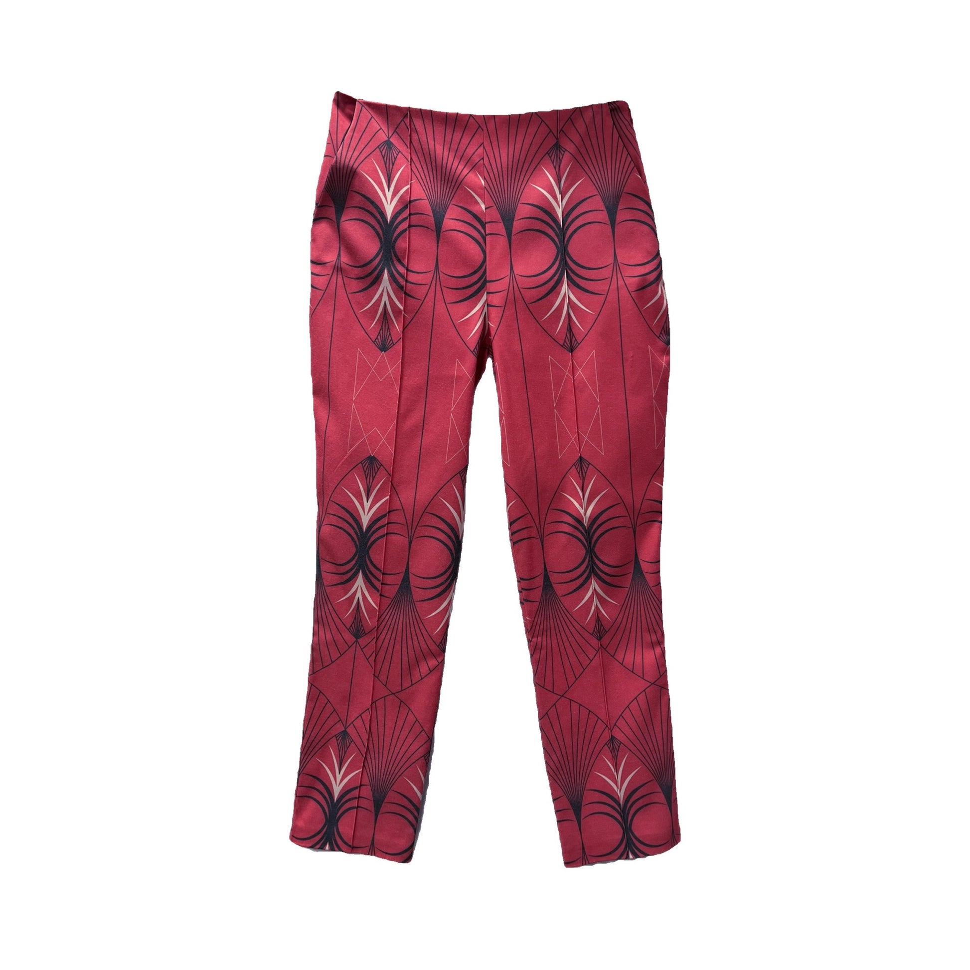 Maxine Trousers are those kicky pants made for high kicks you are going to enjoy this fall! Made from a rich cotton blend, so gentle against the skin, printed in 2 of our favourite art deco patterns of the season, the Fantastic Black and the Palmagic Red, they are designed to sit high on the waist with a crease in front. They feature a zipper fastening in the side and side pockets.