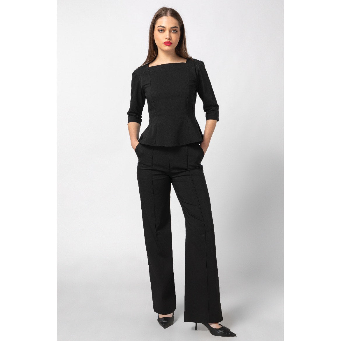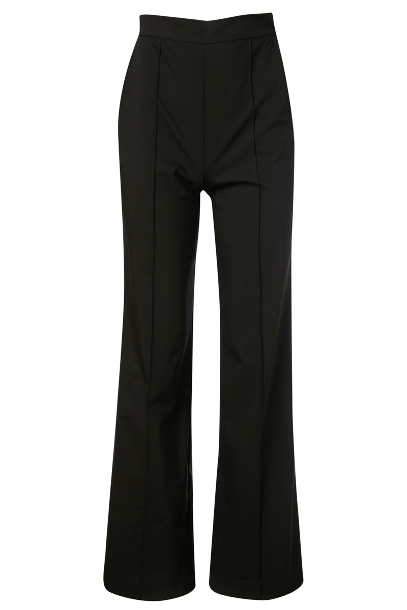 Fits true to size, take your normal size. High rise, cut for a straight leg fit with a flared hem. Crease in front. Zipped side with invisible zipper (YKK zipper). Side pockets. Mid-weight, stretchy material. Made in Greece.