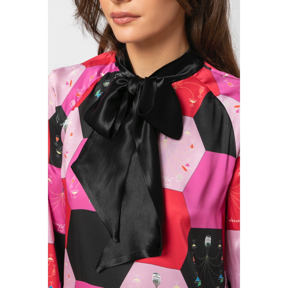 True to size, take your normal size. Motif designed exclusively for The MAnnequin Collection. Mini length. A-line. Silky touch. Long sleeves with satin cuffs. Straight hem. Satin bow tie on the neck. Hidden side pockets. Light weight fabric. Made in Greece.