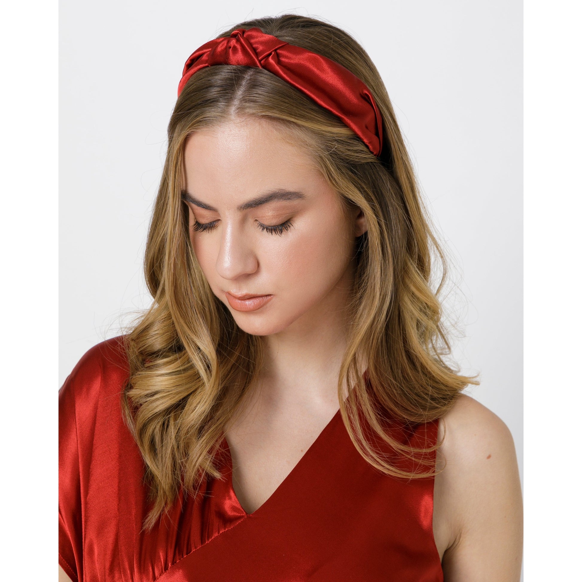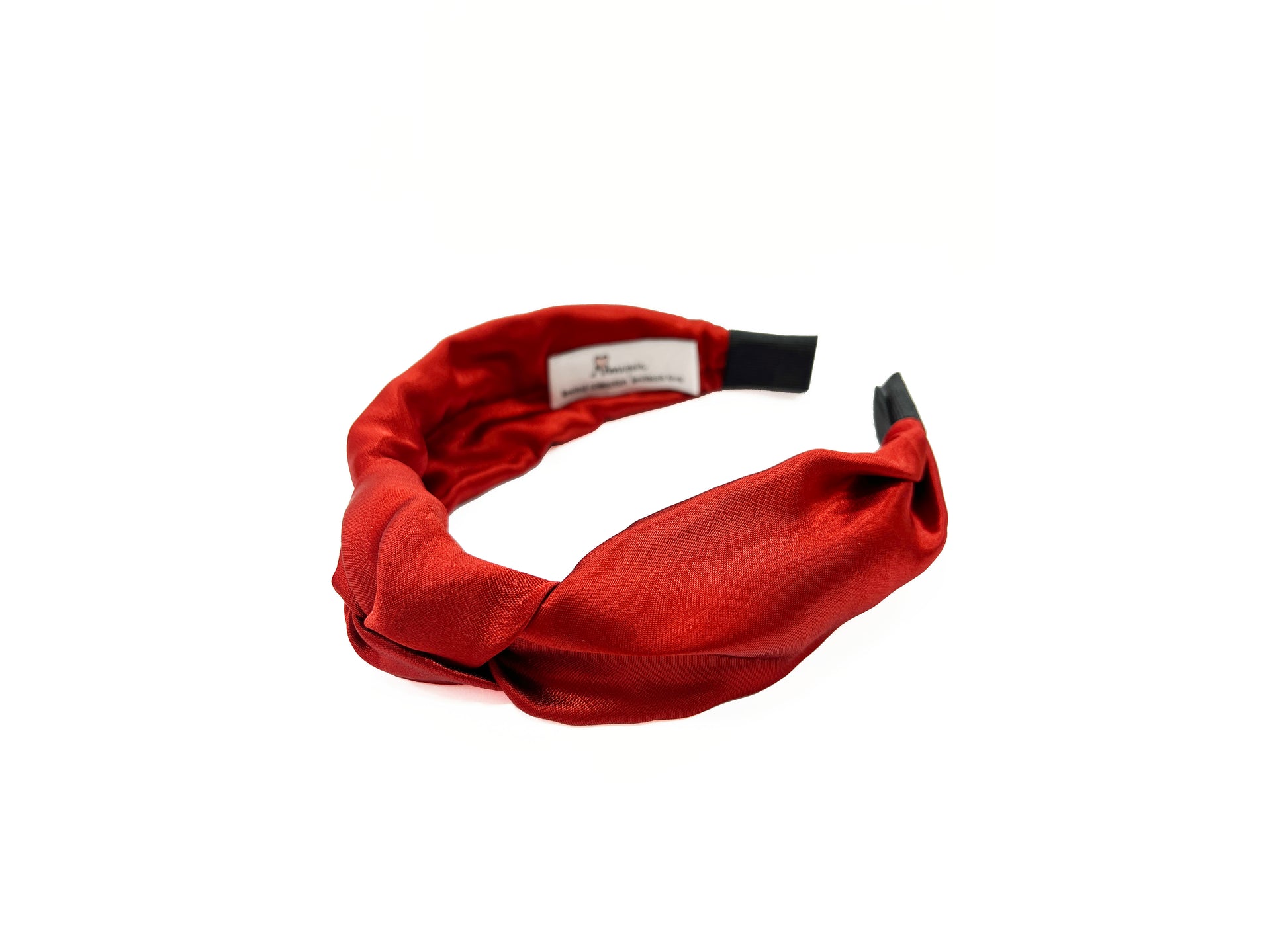One size. Length: 37cm. Silky texture. Knot in the middle. Black plastic headband. Gross grain ribbon.