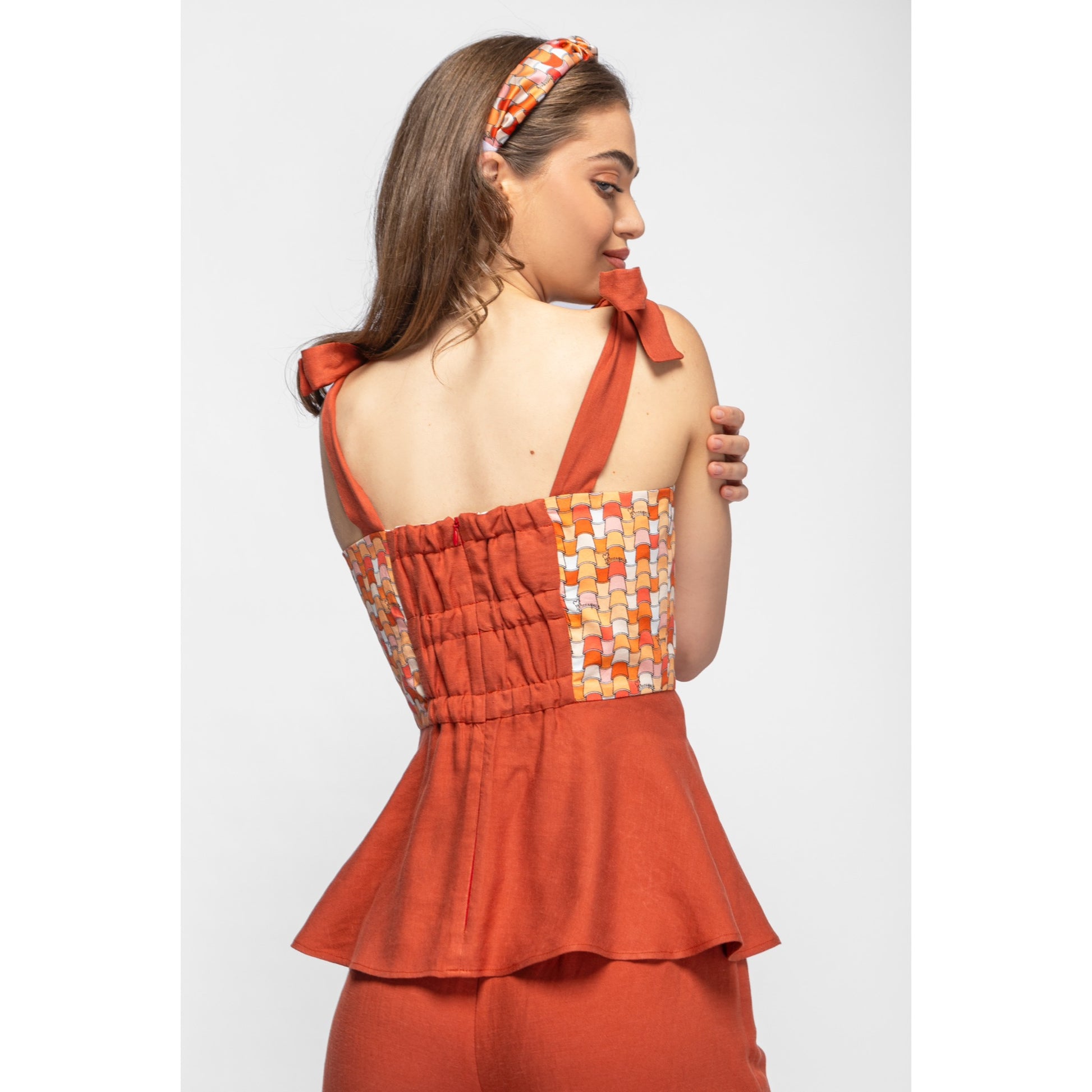 Sprout Top - Ruffled Linen Top with Printed Details (Terracotta Tiles/Terracotta)