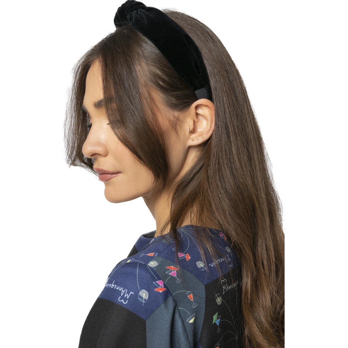 One size. Length: 37cm. Velvet texture. Knot in the middle. Black plastic headband. Gross grain ribbon.