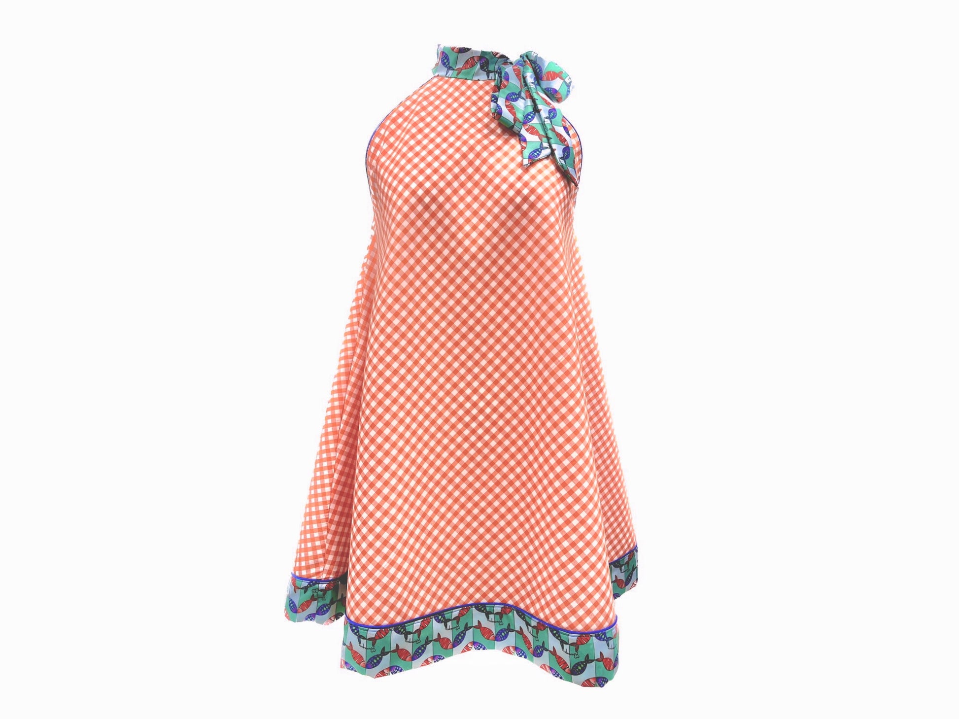 **The about the garment: A mini dress designed so comfortably, making it an ideal choice for summer strolls by the sea or wearing on sunny weekends, when you are back. This 60's style dress is made from a cotton-blend with orange and white gingham checks, with a floaty, voluminous silhouette that creates movement as you walk. It features side pockets and a tie belt in the "M" motif that ties around your neck in a beautiful bow.